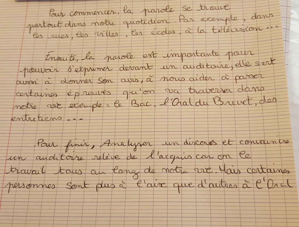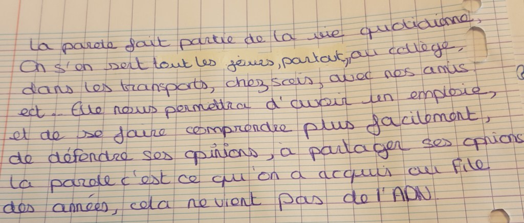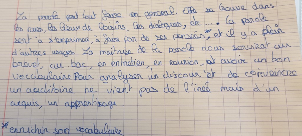 Quand les dix minutes sont écoulées, les élèves à l’intérieur de chaque groupe rédigent une définition de ce que peut faire la parole. Chaque rapporteur lit à voix haute le paragraphe rédigé à la classe.