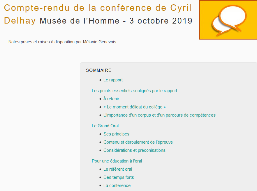 Il ne faut surtout pas attendre le lycée pour travailler l’oral comme le précise Cyril Delhay dans sa conférence du 3 octobre 2019 au Musée de l’homme.
